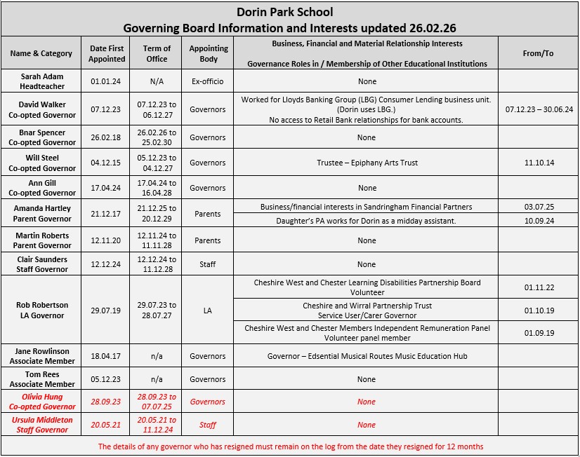 The Governing Board consists of 5 co-opted governors (one vacancy as at 07.07.25), 1 local authority governor, 2 elected parent governors, 1 staff governor and the Headteacher (ex-officio).